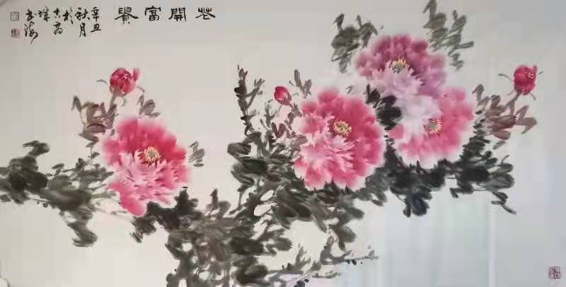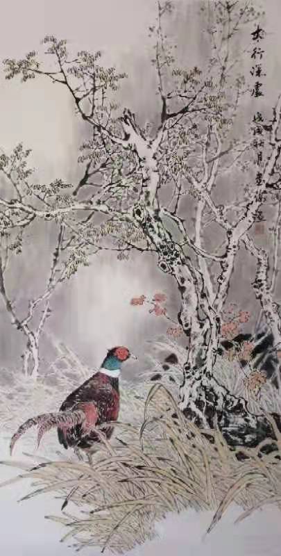 翱翔云天的苍鹰、昂首高歌的雄鸡、雍荣华贵的牡丹、清风高标的梅兰竹菊常现笔端,更乐山好水陶醉于泉林野径之间,抒写心中之景。
